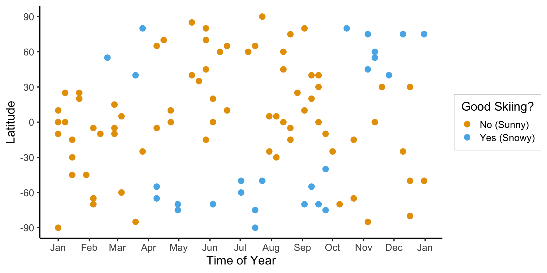 scale_color_manual(name="Good Skiing?", values=c(cbPalette[1], cbPalette[2]), labels=c("No (Sunny)","Yes (Snowy)")) +