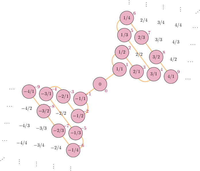 \[ \begin{align*} \begin{array}{ll} s: \mathbb{N} \leftrightarrow \mathbb{Z} & s(n) = (-1)^n \left\lfloor \frac{n+1}{2} \right\rfloor \\ h_+: \mathbb{Z}^+ \leftrightarrow \mathbb{Q}^+ & p_1^{a_1}p_2^{a_2}\cdots \mapsto p_1^{s(a_1)}p_2^{s(a_2)}\cdots \\ h: \mathbb{Z} \leftrightarrow \mathbb{Q} & h(n) = \begin{cases}h_+(n) &n > 0 \\ 0 & n = 0 \\ -h_+(-n) & n < 0\end{cases} \\ (h \circ s): \mathbb{N} \leftrightarrow \mathbb{Q} & ✅🤯 \end{array} \end{align*} \]