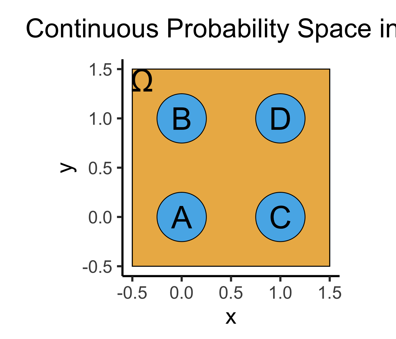 \[ \Pr(A) = \underbrace{\frac{\text{Area}(\{A\})}{\text{Area}(\Omega)}}_{\mathclap{\small \text{Probability }\textbf{density}}} = \frac{\pi r^2}{s^2} = \frac{\pi \left(\frac{1}{4}\right)^2}{4} = \frac{\pi}{64} \]