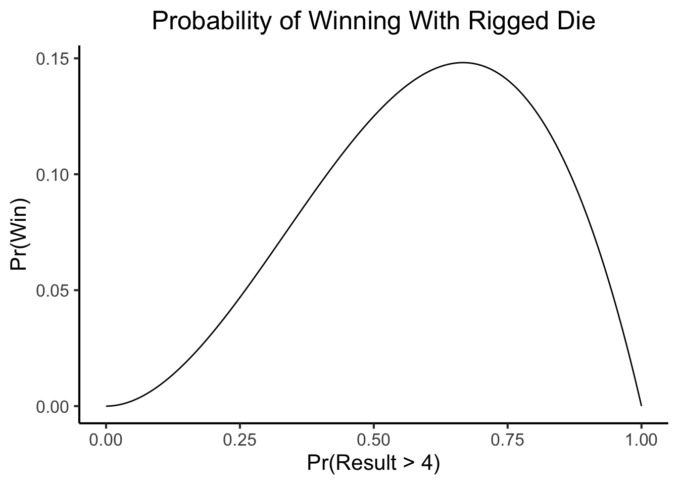 Write a function that computes your likelihood of winning (i.e., your likelihood of getting this sequence of three rolls), for any die with any probability of producing an outcome greater than 4.