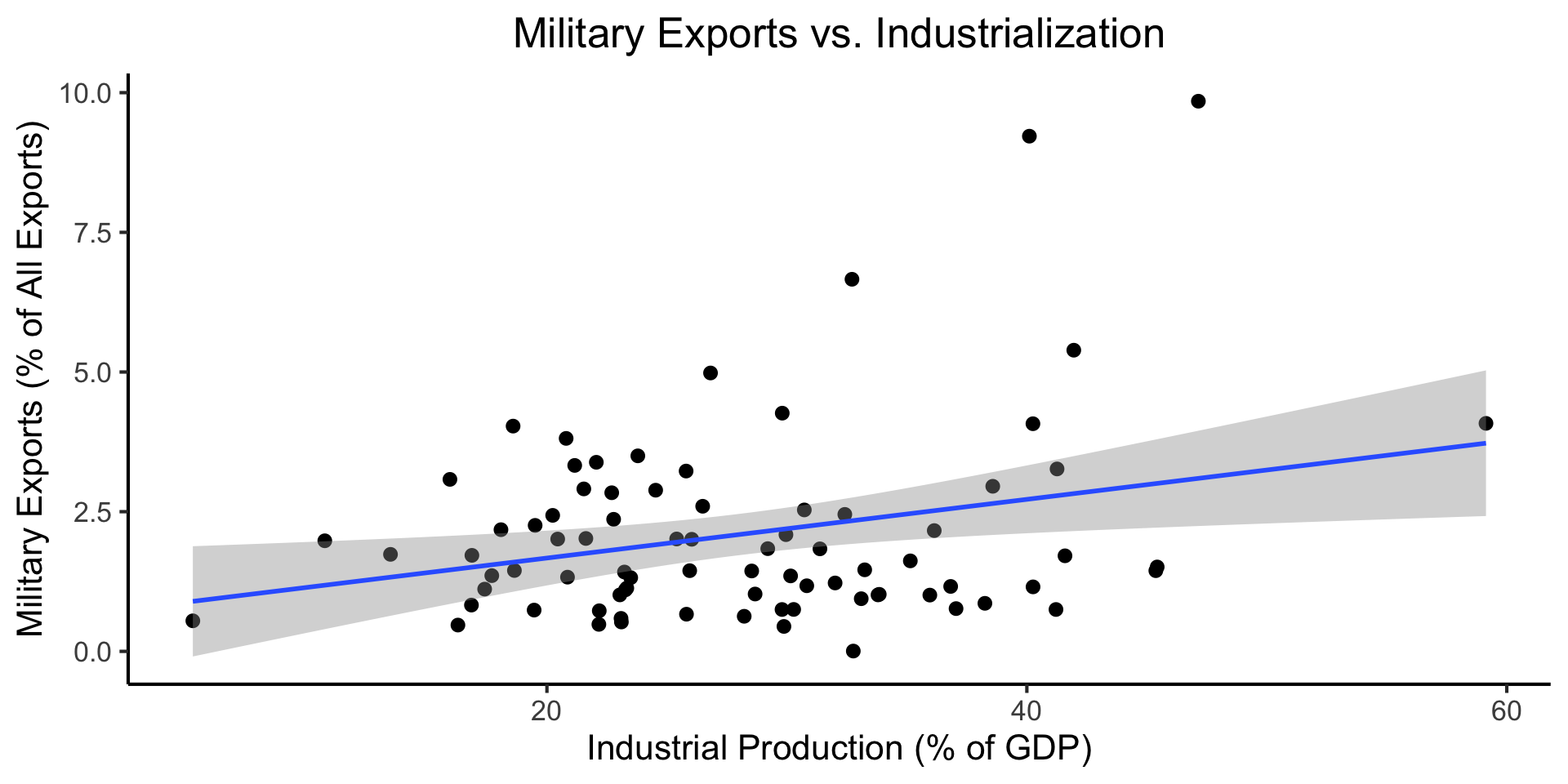 mil_plot <- gdp_df |> ggplot(aes(x=industrial, y=military)) +