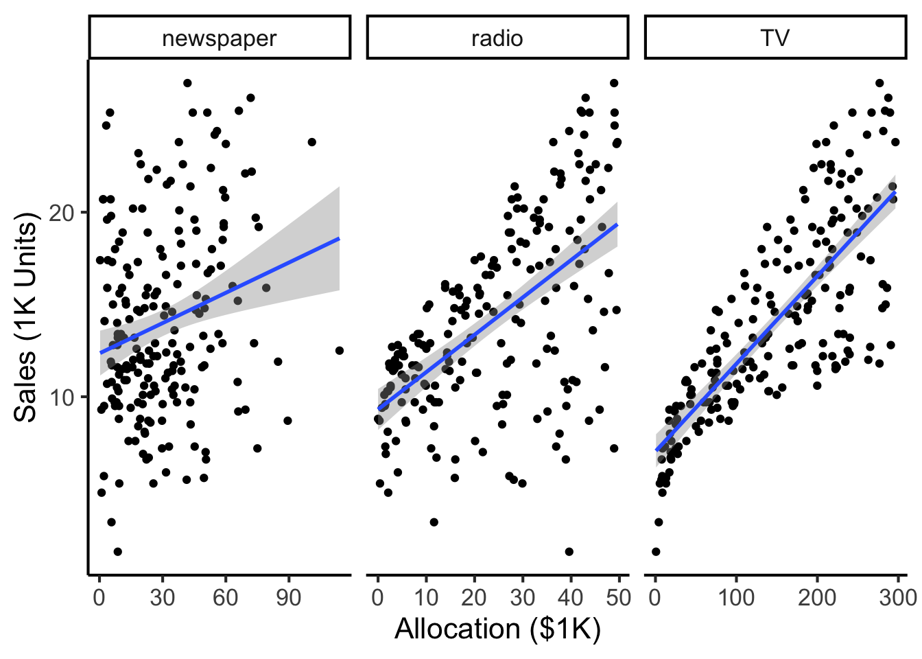 radio ads is associated with…\[ \texttt{sales} = \overset{*}{\beta_0} + \overset{*}{\beta_1}\texttt{newspaper} \]