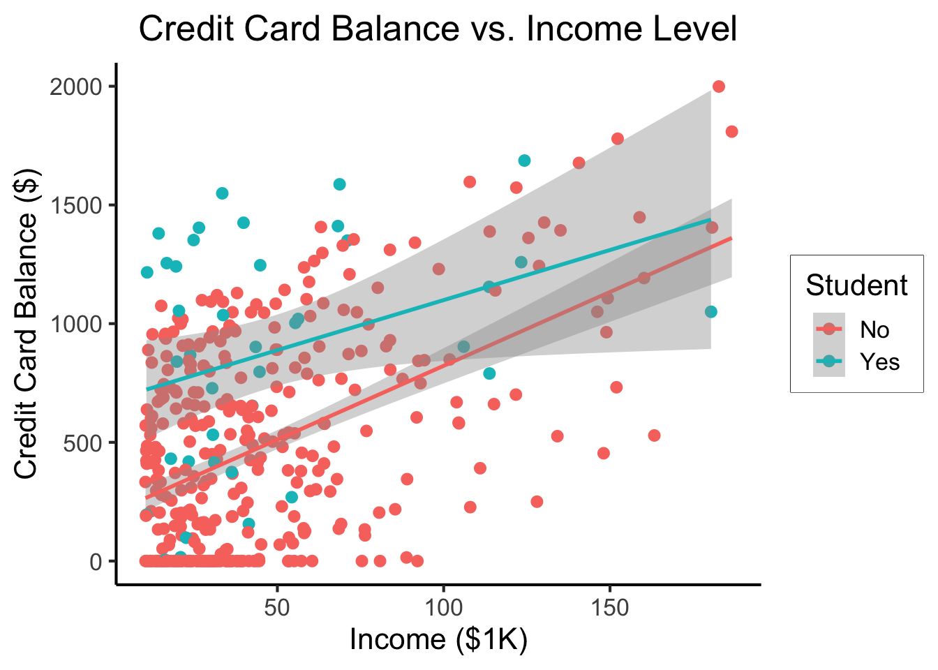 student_plot <- credit_df |> ggplot(aes(x=Income, y=Balance, color=Student)) +