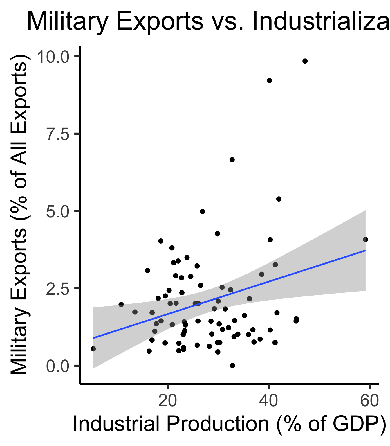 ggplot(gdp_df, aes(x = industrial, y = exports)) +
