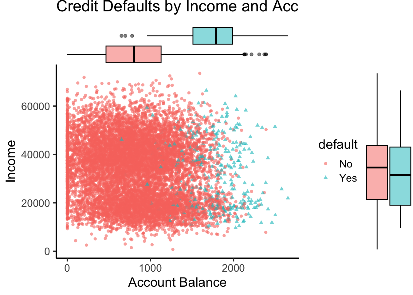 default_plot <- default_df |> ggplot(aes(x=balance, y=income, color=default, shape=default)) +