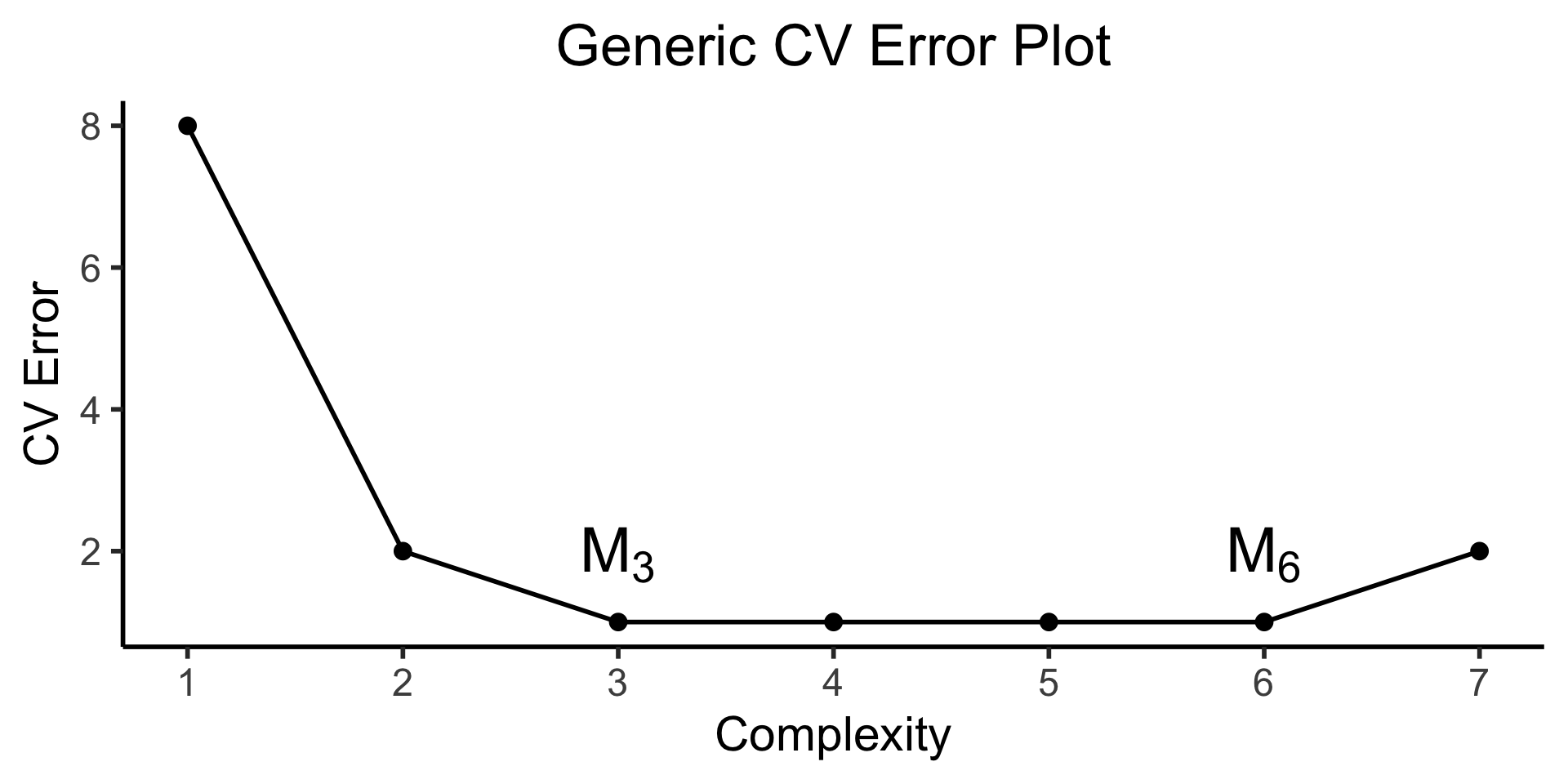 CV plots will often look like (complexity on \(x\)-axis and CV error on \(y\)-axis):