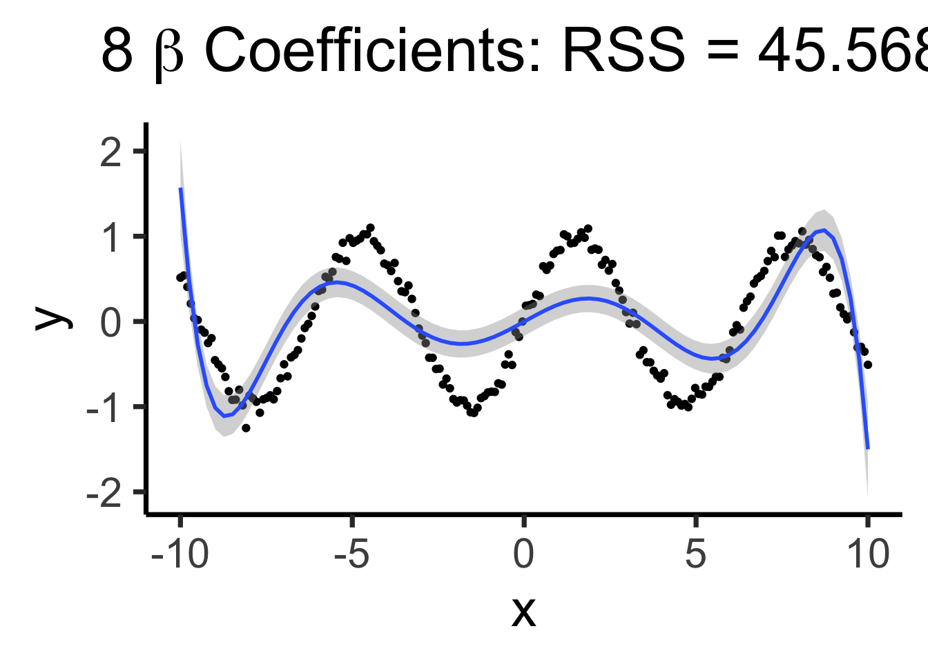 poly8_label <- TeX(paste0("8 $\\beta$ Coefficients: RSS = ",poly8_rss))