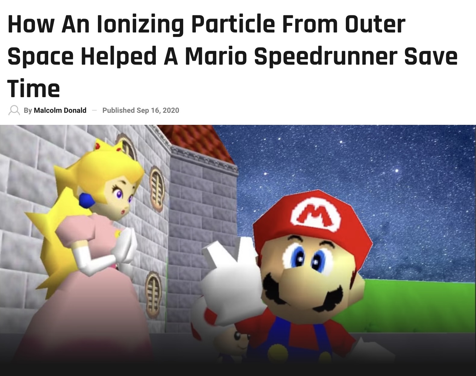 During the race, an ionizing particle from outer space collided with DOTA_Teabag’s N64, flipping the eighth bit of Mario’s first height byte. Specifically, it flipped the byte from 11000101 to 11000100, from “C5” to “C4”. This resulted in a height change from C5837800 to C4837800, which by complete chance, happened to be the exact amount needed to warp Mario up to the higher floor at that exact moment.