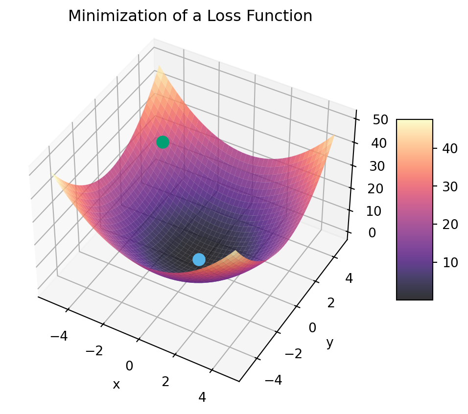 import matplotlib.pyplot as pltimport numpy as nprng = np.random.default_rng(seed=5302)from matplotlib import cmcb_palette = ['#E69F00', '#56B4E9', '#009E73']def loss_fn(x, y):return x**2+ y**2def objective_fn(x, y):return-loss_fn(x, y)rand_v = np.array([ rng.uniform(low=-4, high=0), rng.uniform(low=0, high=4),])def gen_surface_plot( points, title=None, minimization=True, label_points=False, arrows=False, elevation=42, azimuth=-60):if title isNone: title ="Minimization of a Loss Function"ifnot minimization: title ="Maximization of an Objective Function" opt_fn = loss_fn if minimization else objective_fn fig, ax = plt.subplots( subplot_kw={"projection": "3d","title": title,"computed_zorder": False, } )# Generate the surface representing the value of# the loss function (the z coordinate) for any# pair of (x,y) values x_range = np.arange(-5, 5, 0.25) y_range = np.arange(-5, 5, 0.25) x_vals, y_vals = np.meshgrid(x_range, y_range) z_vals = opt_fn(x_vals, y_vals)# Plot the points given by the points argument! points_x = [p[0] for p in points] points_y = [p[1] for p in points] points_z = [opt_fn(p[0],p[1]) for p in points] ax.scatter(points_x, points_y, points_z, color=cb_palette[2], s=80, zorder=10)# Add labels to points if label_points is Trueif label_points:for point_index, point inenumerate(points): ax.text(point[0], point[1], loss_fn(point[0], point[1]), str(point_index), zorder=20)# Compute and plot the optimal value opt_z = np.min(z_vals) if minimization else np.max(z_vals) ax.scatter([0], [0], [opt_z], color=cb_palette[1], s=80, zorder=10) surf = ax.plot_surface( x_vals, y_vals, z_vals, cmap='magma', zorder=0, alpha=0.8 ) ax.set_xlabel("x") ax.set_ylabel("y") ax.view_init(elev=elevation, azim=azimuth)# Add arrows if requestedif arrows:for i inrange(len(points) -1): cur_point = points[i] cur_z = loss_fn(cur_point[0], cur_point[1]) next_point = points[i+1] next_z = loss_fn(next_point[0], next_point[1]) x_diff = next_point[0] - cur_point[0] y_diff = next_point[1] - cur_point[1] z_diff = next_z - cur_z ax.quiver( cur_point[0], cur_point[1], cur_z, x_diff, y_diff, z_diff, color ='white', alpha =.8, lw =1, length=1 )# Add a color bar which maps values to colors. fig.colorbar(surf, shrink=0.5, aspect=5) plt.show()gen_surface_plot(points=[rand_v])