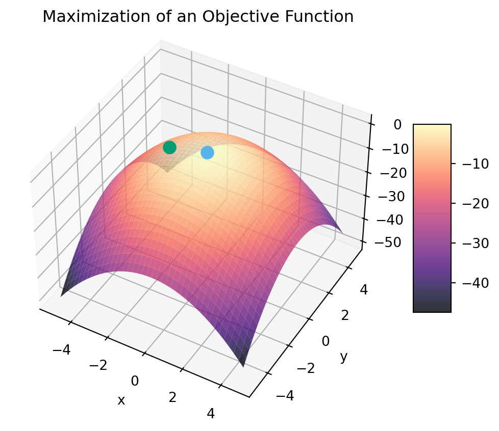 Also note how I made the plot-generation code into a function, here called gen_surface_plot(), which can be immensely helpful for your own plotting adventures, since you can utilize arguments to the functions to quickly change different aspects of the plot. For example, I set this function up to allow “instant” switching from visualization of minimization to visualization of a maximization problem, which means we can just pass minimization=False to the function to generate a plot of what finding the maximum value of a function (the same function, just “flipped over” via \(z \mapsto -z\)):