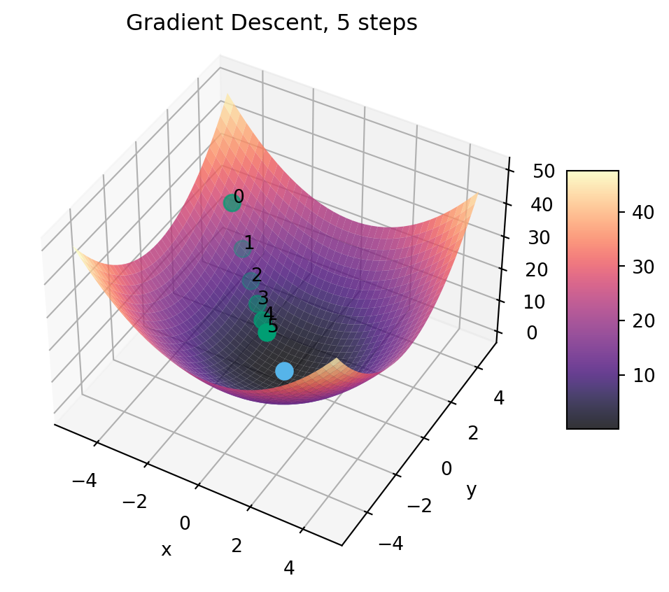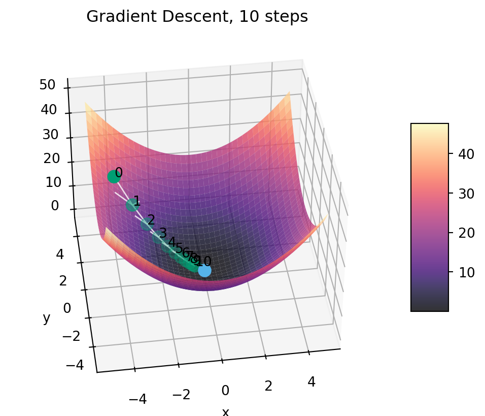Even though it may be obvious in this case the order of the points (meaning, you can just “eyeball” which was the starting point, the second point, the third, and so on), oftentimes it can help to label the order of the points. So, the function takes an optional label_points argument, which shows the order of the points along the gradient path if set to True (for more on how the text() function works in 3D world, see here):