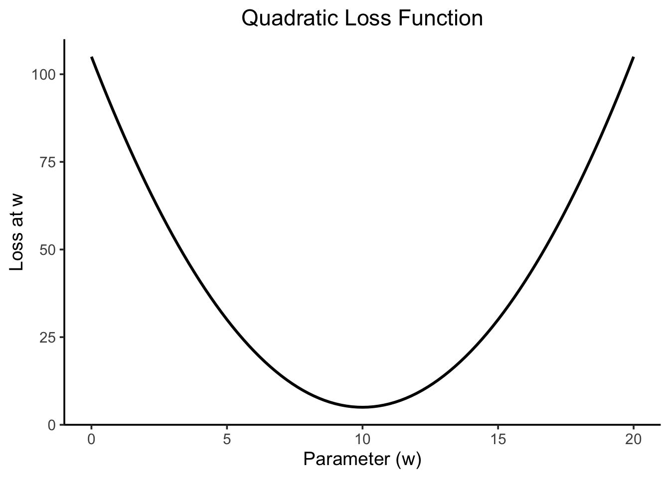 library(tidyverse) |>suppressPackageStartupMessages()loss_fn <-function(w) {# Make predictions using w, then sum the# squared residuals, how good/bad is a line# with slope wreturn((w -10)^2+5)}ggplot() +stat_function(data=tibble(x=c(0, 10)), fun=loss_fn, linewidth=1) +xlim(0, 20) +theme_classic(base_size=14) |>center_title() +labs(title ="Quadratic Loss Function",x ="Parameter (w)",y ="Loss at w" )