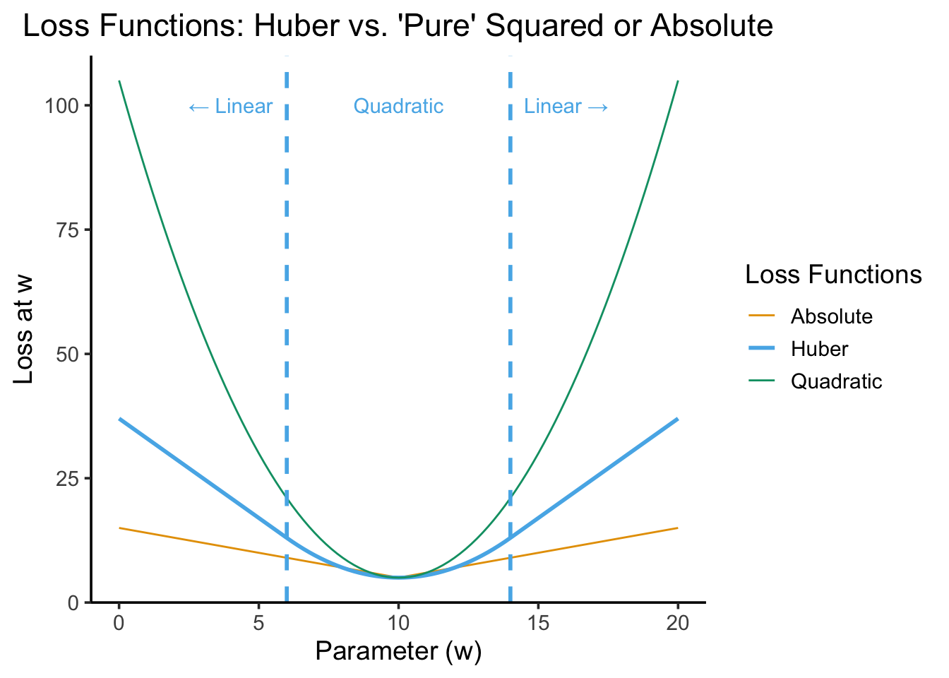 For example, the Huber Loss is often used as an alternative to both “pure” quadratic loss and “pure” absolute loss functions because it penalizes outliers less harshly than \(f(x) = x^2\) but more harshly than \(f(x) = |x|\). The following plot illustrates a “Huberized” version of Lab 1’s loss function, where values within \(\delta = 4\) units of the optimal value \(w^* = 10\) are penalized quadratically, but values more than 4 units away from the optimal value are penalized linearly. Think through what is happening to the second derivative as we move from left to right here (relative to quadratic loss with \(L''(w) = 2\) and absolute loss with \(L''(w) = 1\)):