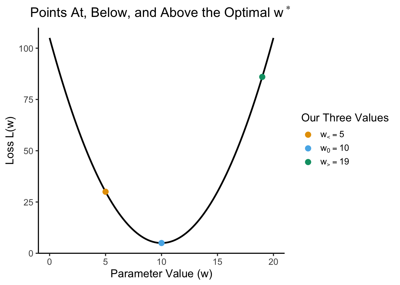 In this case, we’re given the following loss function \(L(w)\): (but, see sidebar on loss functions below!)