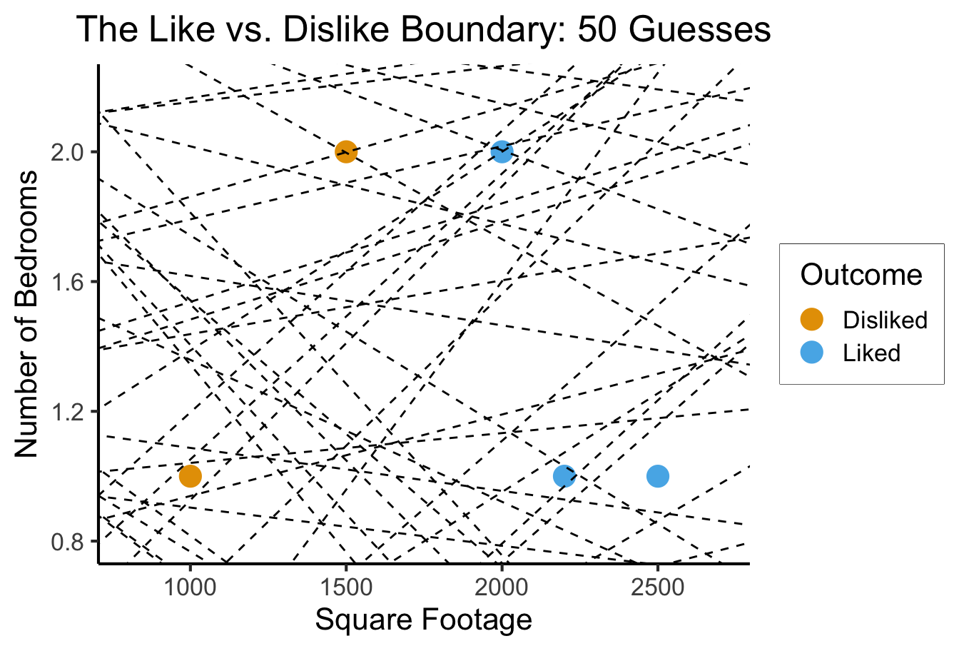 - Naïve idea: Try random lines (each forming a decision boundary), pick “best” one