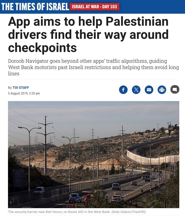 Ayyub, Rami. 2019. “App Aims to Help Palestinian Drivers Find Their Way Around Checkpoints.” The Times of Israel, August. https://www.timesofisrael.com/app-aims-to-help-palestinian-drivers-find-their-way-around-checkpoints/.