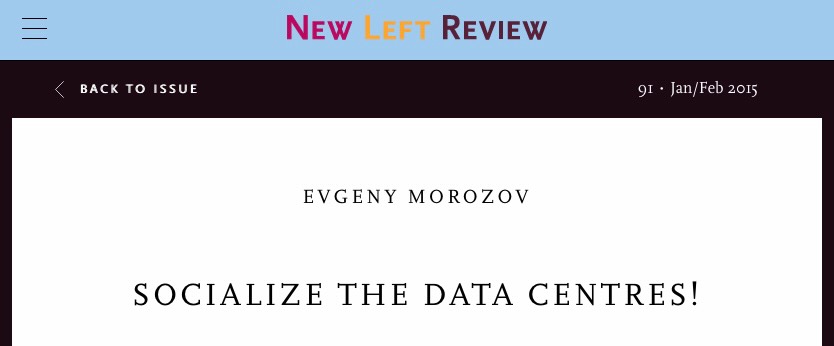 Morozov, Evgeny. 2015. “Socialize the Data Centres!” New Left Review, no. 91 (February): 45–66.