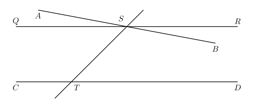 • Euclid’s Fifth Postulate \(P_5\): Given a line and a point not on it, exactly one line parallel to the given line can be drawn through the point.