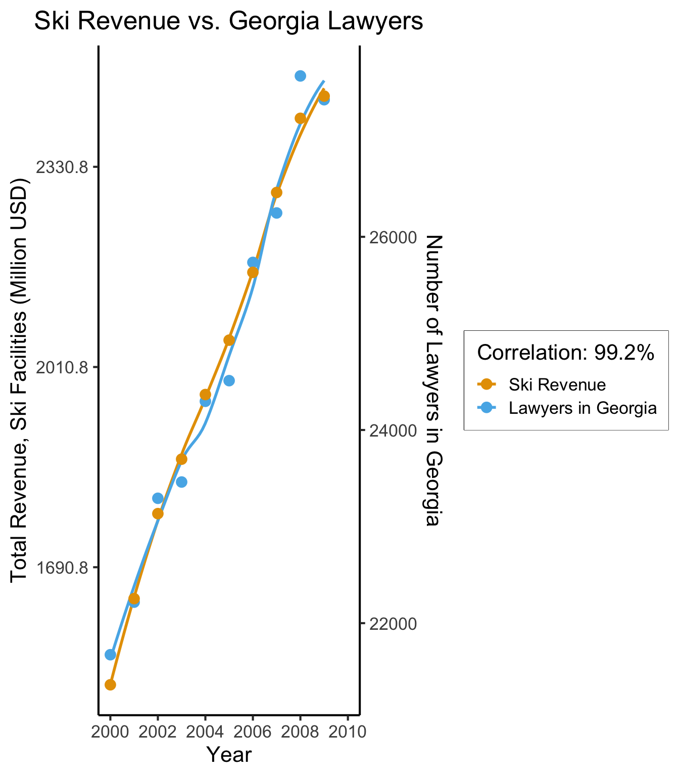 values=c('Ski Revenue'=cbPalette[1], 'Lawyers in Georgia'=cbPalette[2])