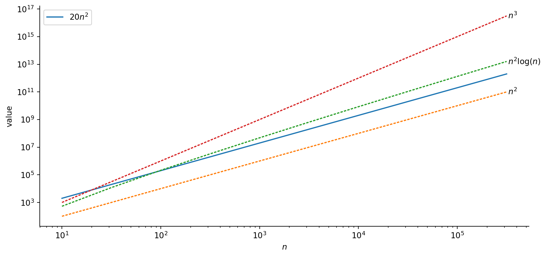 rt_const_df['$20n^2$'] = rt_const_df['$n$'].apply(lambda x: 20*np.power(x,2))