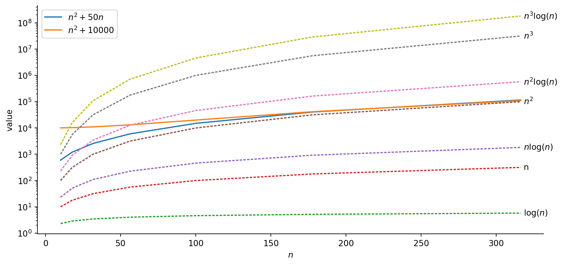 import pandas as pdimport numpy as npimport matplotlib.pyplot as pltimport seaborn as snsn_vals = [np.power(10, k) for k in np.arange(1, 2.75, 0.25)]runtime_df = pd.DataFrame({'$n$': n_vals})runtime_df['$n^2 + 50n$'] = runtime_df['$n$'].apply(lambda x: np.power(x, 2) +50*x)runtime_df['$n^2 + 10000$'] = runtime_df['$n$'].apply(lambda x: np.power(x, 2) +10000)runtime_df['$\log(n)$'] = runtime_df['$n$'].apply(lambda x: np.log(x))runtime_df['n'] = runtime_df['$n$'].copy()runtime_df['$n\log(n)$'] = runtime_df['$n$'].apply(lambda x: x * np.log(x))runtime_df['$n^2$'] = runtime_df['$n$'].apply(lambda x: np.power(x, 2))runtime_df['$n^2\log(n)$'] = runtime_df['$n$'].apply(lambda x: np.power(x,2) * np.log(x))runtime_df['$n^3$'] = runtime_df['$n$'].apply(lambda x: np.power(x, 3))runtime_df['$n^3logn$'] = runtime_df['$n$'].apply(lambda x: np.power(x, 3) * np.log(x))# Get the max values, for labeling the ends of linesmax_vals = runtime_df.max().to_dict()plot_df = runtime_df.melt(id_vars=['$n$'])#print(plot_df)style_map = {col: ''if (col =='$n^2 + 50n$') or (col =='$n^2 + 10000$') else (2,1) for col in runtime_df.columns}fig, ax = plt.subplots(figsize=(11,5))sns.lineplot(plot_df, x='$n$', y='value', hue='variable', style='variable', dashes=style_map)#plt.xscale('log')plt.yscale('log')# extract the existing handles and labelsh, l = ax.get_legend_handles_labels()# slice the appropriate section of l and h to include in the legendax.legend(h[0:2], l[0:2])for label, val in max_vals.items():if (label =='$n$') or (label =='$n^2 + 50n$') or (label =='$n^2 + 10000$'):continueif'logn'in label: label = label.replace('logn', r'\log(n)') ax.text(x = max_vals['$n$'] +2, y = val, s=label, va='center')# Hide the right and top spinesax.spines[['right', 'top']].set_visible(False)plt.show()
