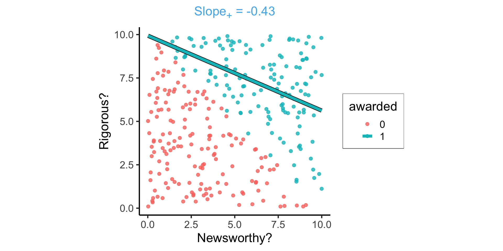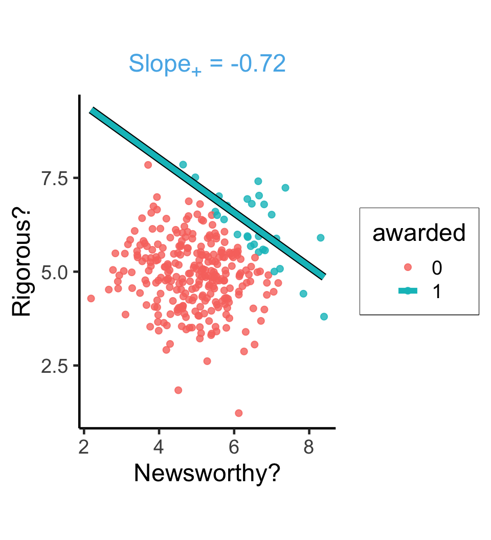 aes(x=newsworthy, y=rigorous, group=factor(awarded)),