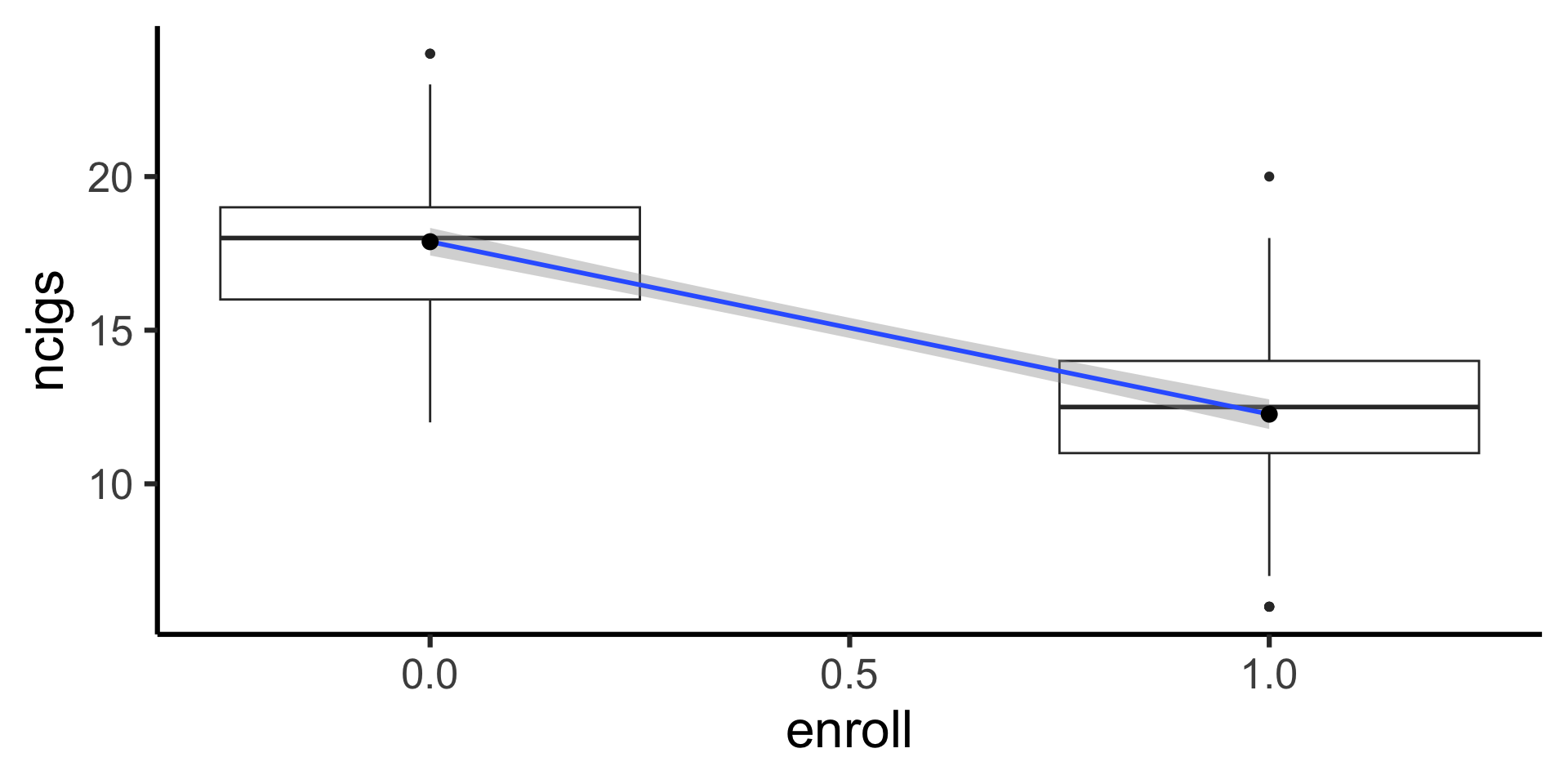 (smoke_mean_df <- smoke_df |> group_by(enroll) |> summarize(mean_ncigs=mean(ncigs)))| enroll | mean_ncigs |