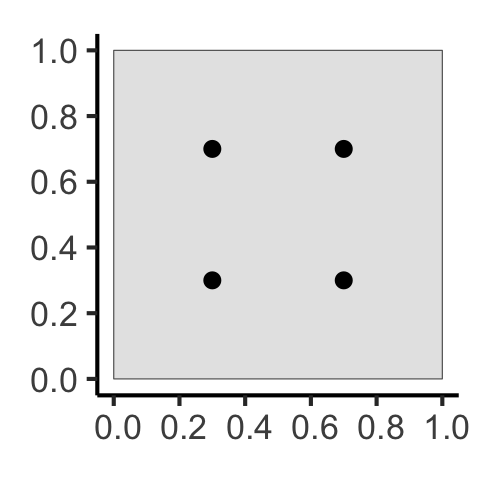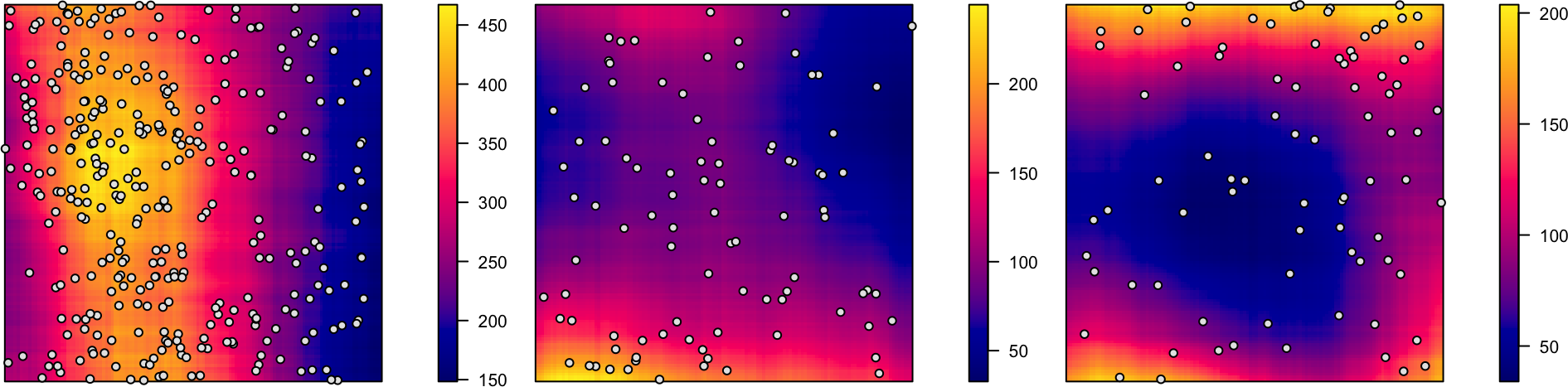 | Events considered individually \(\Rightarrow\) Intensity function \(\lambda(\mathbf{s})\) | Events considered pairwise \(\Rightarrow\) Pairwise Correlation Function \(\textrm{pcf}(\vec{h})\) | |