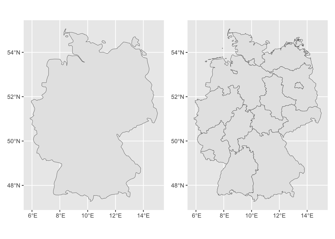 (ggplot (de_national_map) + geom_sf ()) + (ggplot (de_states_map) + geom_sf ())