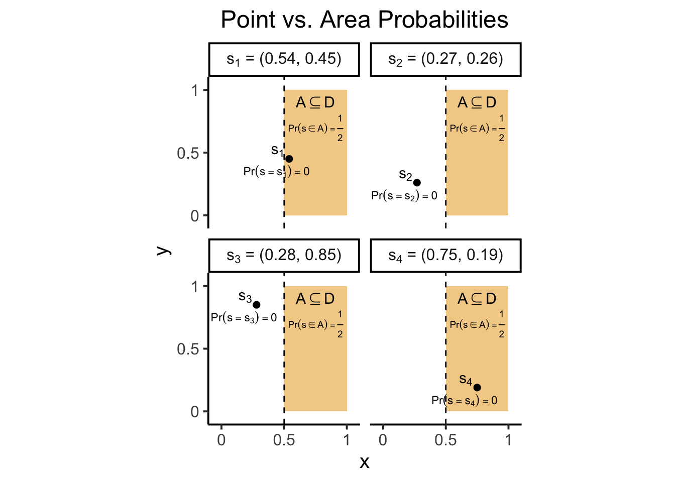 Now, if we take this and try to generalize it into a probabilistic model, we should at minimum be able to ask a question like, what’s the probability of getting this particular point (or any other point in the unit square, but, we have a specific example above we can work with for concreteness). From previous probability and statistics courses you might know that the answer is… zero! When working in continuous spaces like the unit square, we actually can’t compute probabilities for individual, infinitesimally-small points.