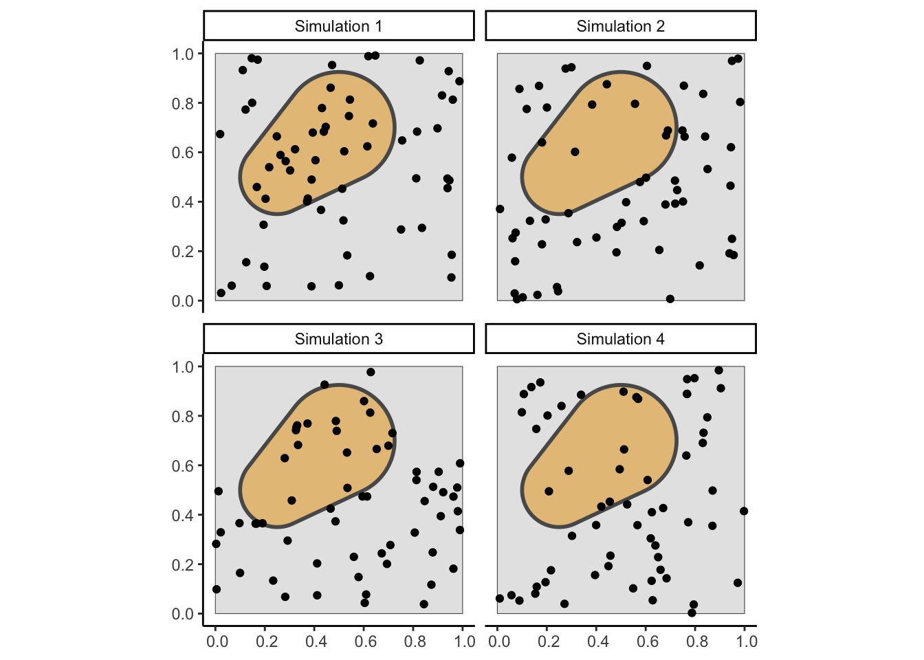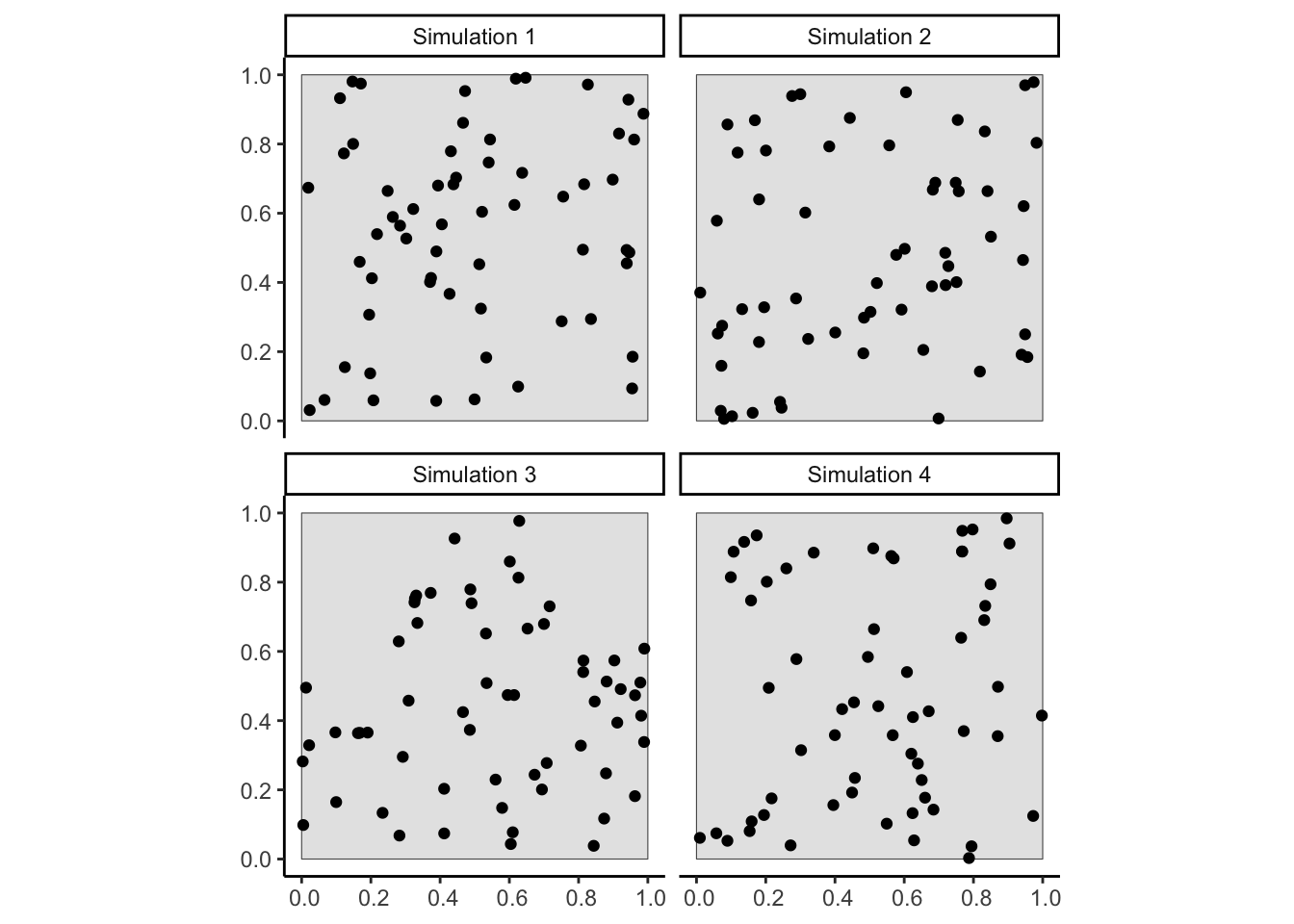 library(tidyverse) |>suppressPackageStartupMessages()library(sf) |>suppressPackageStartupMessages()library(spatstat) |>suppressPackageStartupMessages()window_to_sf <-function(ppp_obj) { window_sf <- sf::st_as_sf(ppp_obj) |>filter(label =="window")return(window_sf)}points_to_sf <-function(ppp_obj) { points_sf <- sf::st_as_sf(ppp_obj) |>filter(label =="point")return(points_sf)}sim_points_to_sf <-function(ppp_obj, sim_index, label_num_points=FALSE) {# Extract points from ppp object points_sim_sf <-points_to_sf(ppp_obj)# Add *sim_index* as an additional column. If# label_num_points is TRUE, also add the number# of generated points to the sim column labels sim_label <-ifelse( label_num_points,paste0(sim_index, ": N = ", nrow(points_sim_sf)), sim_index ) points_sim_sf <- points_sim_sf |>mutate(sim_label = sim_label,sim_N =nrow(points_sim_sf) )return(points_sim_sf)}sim_list_points_to_sf <-function(ppp_list_obj, label_num_points=FALSE) {# This produces a *list* of sf objects points_sf_list <-imap( ppp_list_obj, \(x, idx) sim_points_to_sf(x, idx, label_num_points) )# And this concatenates the list elements (by row)# together to produce a single combined sf object all_points_sf <-bind_rows(points_sf_list)return(all_points_sf)}set.seed(6805)binom_ppp_sims <- spatstat.random::rpoint(60, nsim=4)win_sf <-window_to_sf(binom_ppp_sims[[1]])points_sf <-sim_list_points_to_sf(binom_ppp_sims)ggplot() +geom_sf(data=win_sf ) +geom_sf(data=points_sf,size=1.5 ) +theme_classic() +facet_wrap(vars(sim_label),nrow=2, ncol=2 )