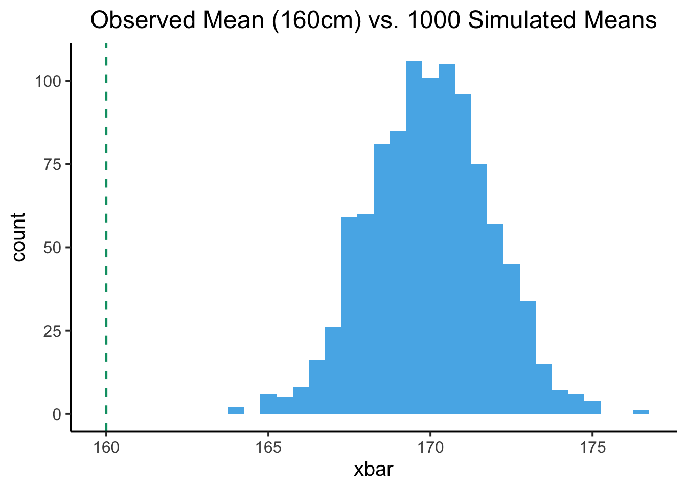 The vertical (dashed) green line in this plot is the mean we actually obtained from our sample of 30 students. The blue histogram represents all of the means we got when we simulated taking a sample of size \(N = 30\) from the hypothesized population distribution \(\mathcal{N}(170, 10)\)… and what it tells us is that the mean we actually observed is not very likely to arise from our hypothesized population… Meaning, in turn, that we decrease our confidence in our hypothesis, relative to whatever our confidence was before we collected this sample!