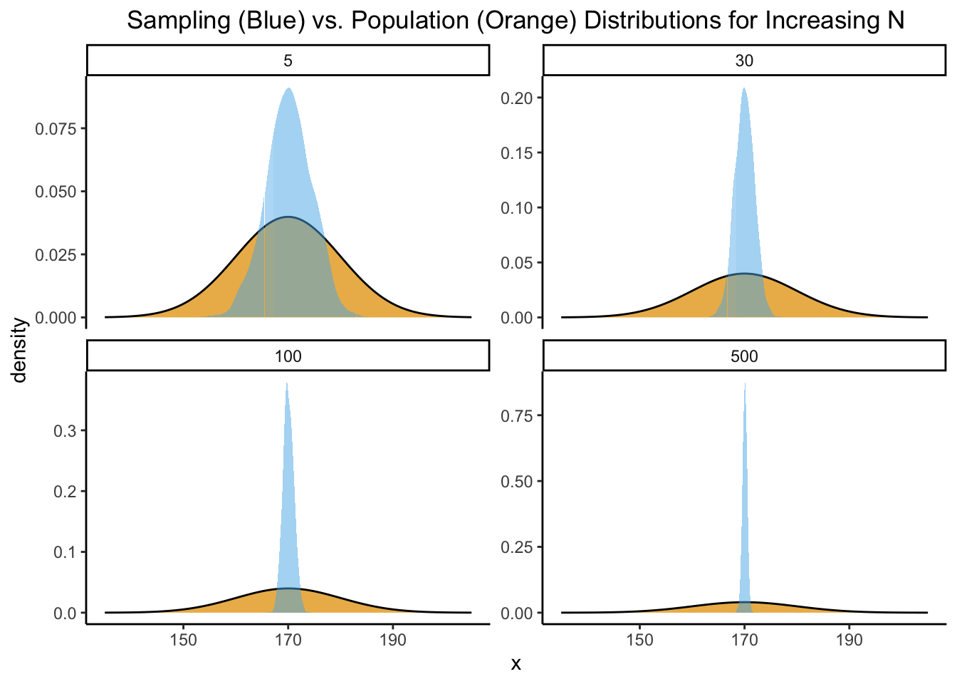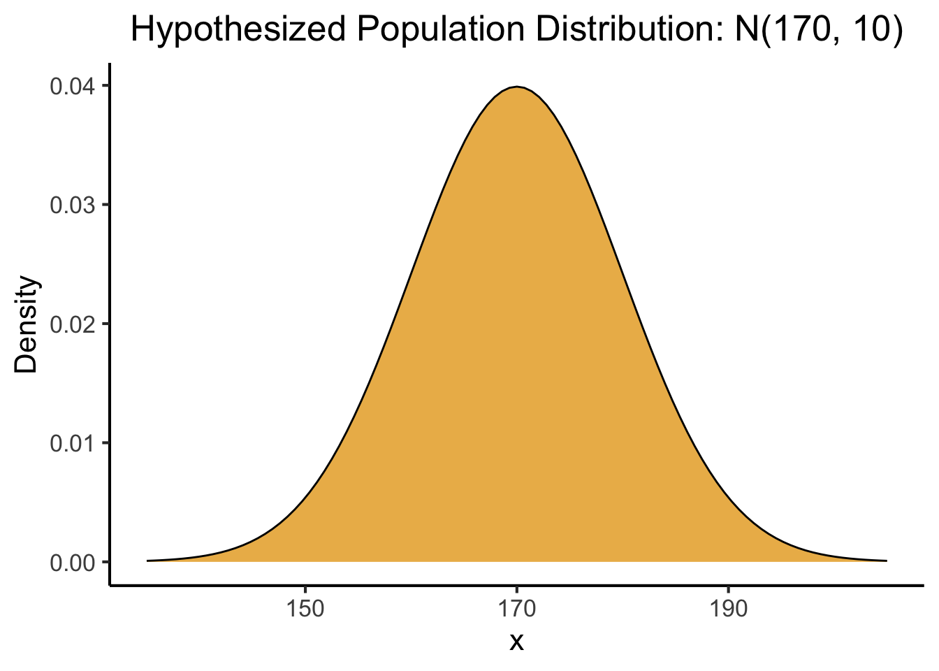 Continuing our above example, if we think that the “true” mean height of Georgetown students is \(\mu = 170\text{cm}\), we can take a sample of \(N\) Georgetown students and compare the mean height value of this particular sample with the distribution of mean height values that a population distribution with \(\mu = 170\text{cm}\) would generate.