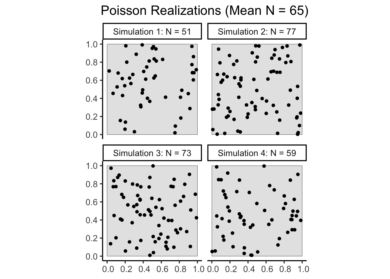 library(spatstat) |>suppressPackageStartupMessages()set.seed(6805)pois_ppp_list <- spatstat.random::rpoispp(lambda=60, nsim=4)pois_win_sf <-window_to_sf(pois_ppp_list[[1]])pois_points_sf <-sim_list_points_to_sf( pois_ppp_list,label_num_points=TRUE)# Compute the mean number of points across the four# realizationsmean_N <- pois_points_sf |> sf::st_drop_geometry() |>group_by(sim_label) |>summarize(first_N =first(sim_N)) |>summarize(mean_N =mean(first_N))ggplot() +geom_sf(data=pois_win_sf ) +geom_sf(data=pois_points_sf ) +theme_classic(base_size=14) +facet_wrap(vars(sim_label),nrow=2, ncol=2 ) +labs(title=paste0("Poisson Realizations (Mean N = ", mean_N,")" ) ) +theme(plot.title =element_text(hjust=0.5))