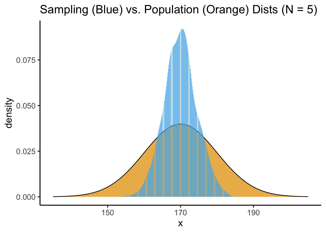 We won’t have any way of knowing the actual values\(\mu\) and \(\sigma\) in practice (if we did, we wouldn’t need to use this whoe sampling thing in the first place), but to make our visualization a little more concrete, let’s assume that this abstract population mean height is \(\mu = 170\text{cm}\) and population mean SD is \(\sigma = 10\text{cm}\). Then the above visualization becomes:
