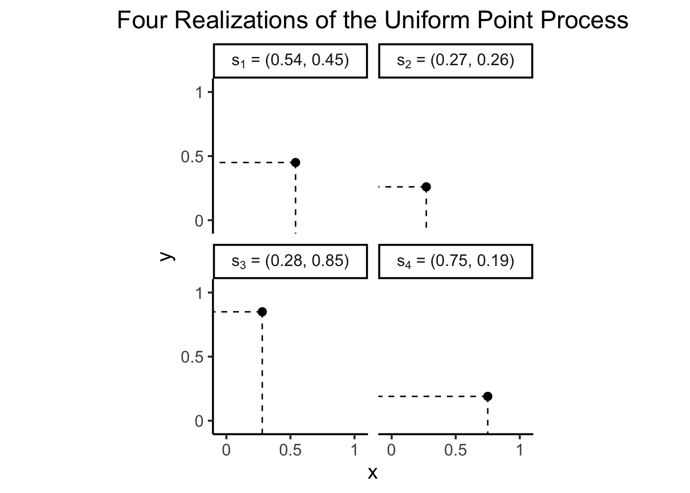 library(latex2exp)set.seed(6862)x_coords <-runif(n =4, min =0, max =1) |>round(2)y_coords <-runif(n =4, min =0, max =1) |>round(2)rand_point_df <- tibble::tibble(index=1:4,x=x_coords,y=y_coords)rand_point_df <- rand_point_df |>mutate(point_tex_str =paste0('$s_', index,'$' ),point_prob_tex_str =paste0('$\\Pr(s=s_', index,') = 0$' ),label_tex_str =paste0( point_tex_str,' = (', x,", ", y,")" ))rand_point_df$point_tex <-as.list(TeX(rand_point_df$point_tex_str))rand_point_df$point_prob_tex <-as.list(TeX(rand_point_df$point_prob_tex_str))rand_point_df |>select(index, x, y, point_tex_str)