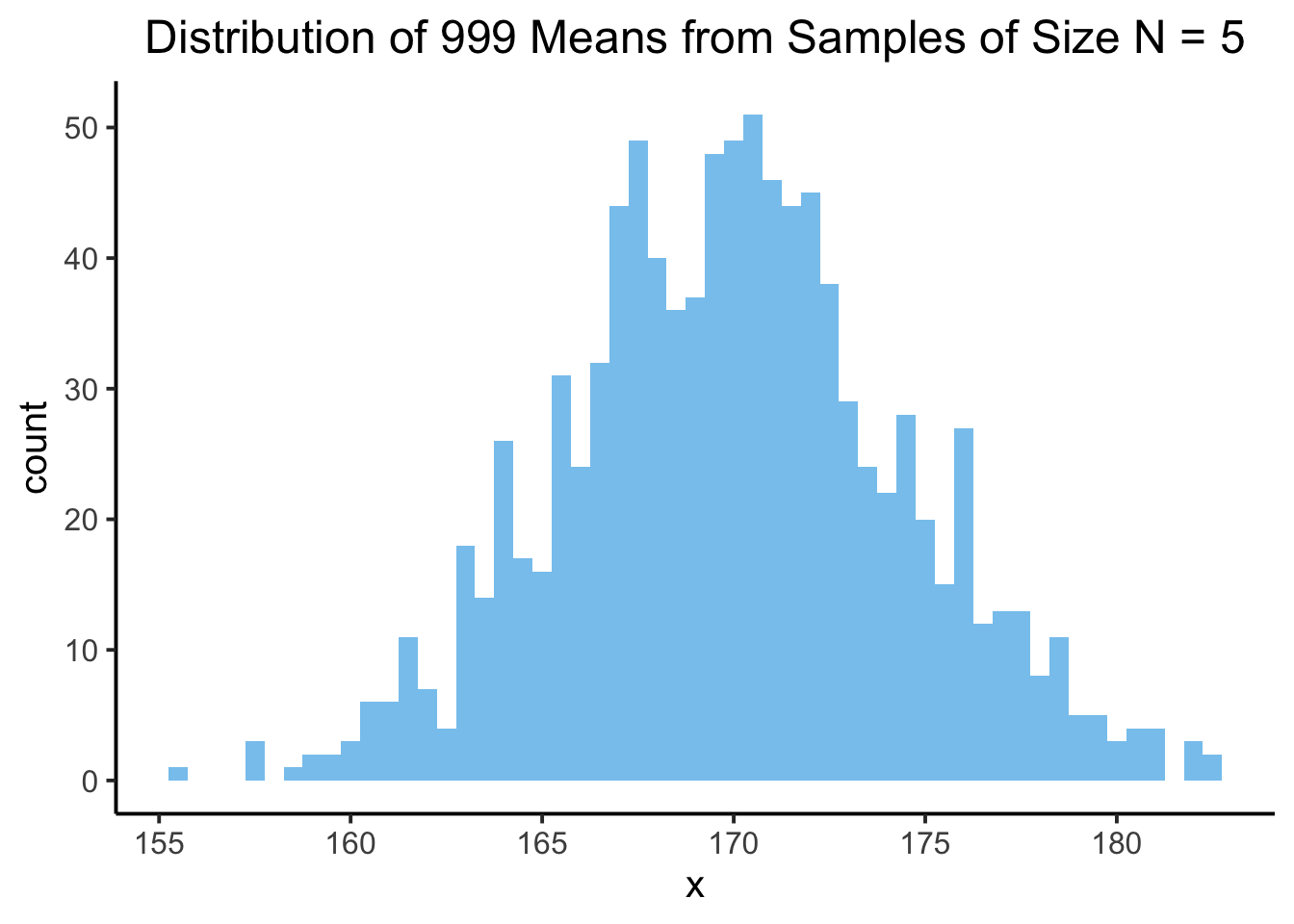 sample_mean_df <-tibble(x=sample_means)sample_plot <- sample_mean_df |>ggplot(aes(x=x)) +geom_histogram(binwidth=0.5,fill=cb_palette[2],alpha=0.75 ) +theme_classic(base_size=15) +labs(title="Distribution of 999 Means from Samples of Size N = 5") +theme(plot.title =element_text(hjust=0.5))sample_plot