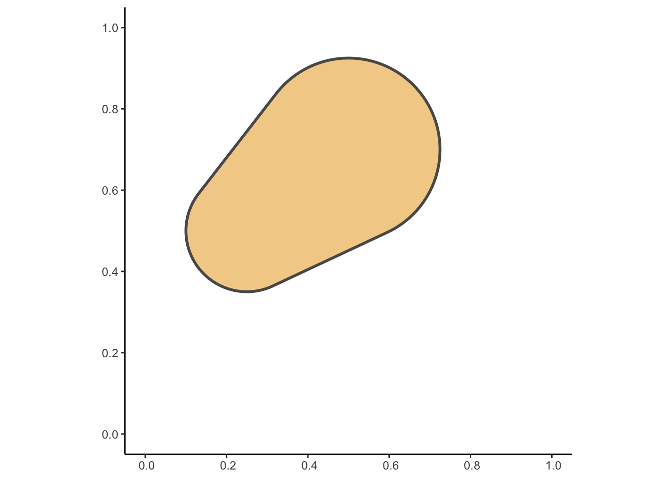 library(sf) |>suppressPackageStartupMessages()# One circle with large radius at (0.5, 0.7), plus# a circle with smaller radius at (0.25, 0.5)cent_df <- tibble::tribble(~x, ~y, ~r,0.5, 0.7, 0.225,0.25, 0.5, 0.15,)# Convert from df to sfcent_sf <- sf::st_as_sf( cent_df,coords=c('x','y'))# Use st_buffer to "transform" from points to circles# with desired radiibuf_sf <- sf::st_buffer( cent_sf,dist=cent_sf$r)# Compute the *union* of the two circlesunion_sf <- sf::st_union(buf_sf)# Transform into a single combined shape via st_convex_hullhull_sf <- sf::st_convex_hull(union_sf)# Print out the area of this final shapeprint(sf::st_area(hull_sf))